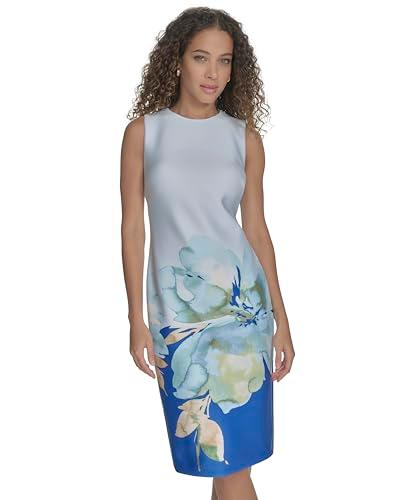 Soft scuba fabric sculpts a fitted sheath silhouette with a classic round neckline and sleeveless design, perfect for year-round wear. The knee-length dress features a striking floral print concentrated on the skirt, blending serene blues and whites for a subtle yet elegant statement. Its polished yet versatile style suits workwear, date nights, and evening events effortlessly. The covered back and invisible zipper maintain a sleek profile, while the matte finish adds a modern touch to this timeless piece.