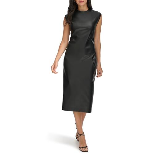 Matte black leather shapes a fitted sheath silhouette that falls to a sophisticated midi length, perfect for transitioning seamlessly from office hours to evening events. The sleeveless design with a round neckline offers a clean, polished look, embodying classic business chic style. This versatile dress pairs effortlessly with heels or jackets, making it an ideal choice for workwear, night outs, and everyday elegance. Crafted from leather, it provides a sleek texture and durability suited for autumn, winter, and spring wardrobes.