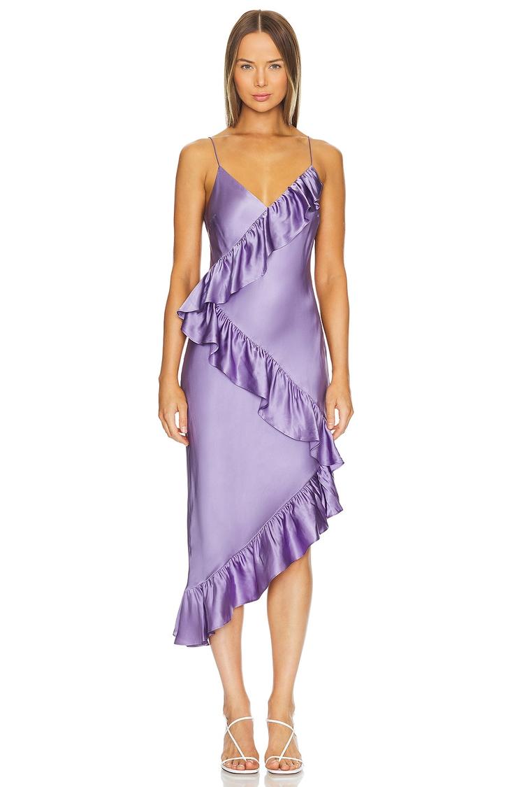 Shimmering purple silk satin creates a sleek and slim silhouette with delicate spaghetti straps and a flattering V-neckline. The midi-length hem features asymmetric ruffles that cascade elegantly across the front and hemline, adding a romantic touch. Fully lined for comfort, this slip dress exudes modern elegance and sexy appeal. Ideal for spring and summer evenings, it's perfect for cocktail parties, date nights, or a stylish night out on the town.