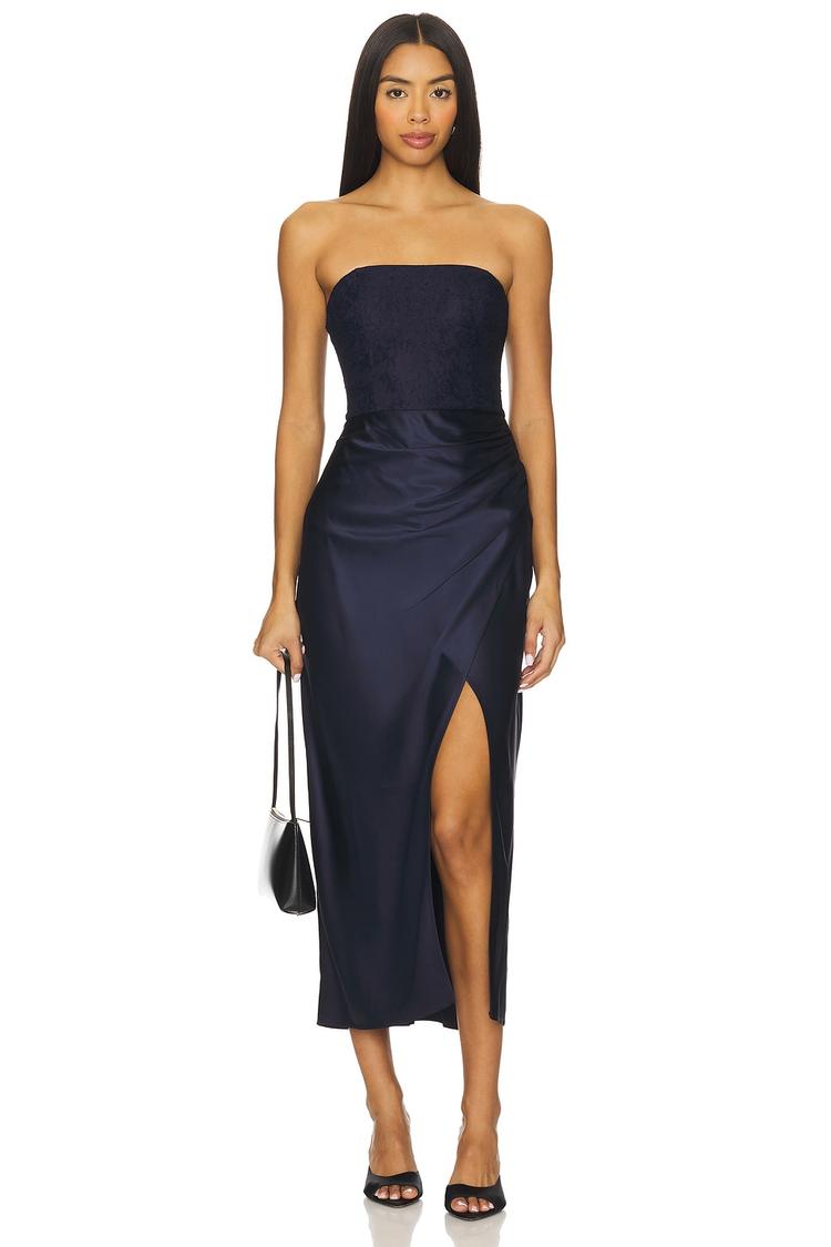 A sleek strapless slip dress in a deep matte navy hue highlights a fitted silhouette with a boned bodice and semi-sheer bust for subtle allure. The midi length features a daring slit that enhances movement, while a hidden side zipper and non-slip silicone trim ensure a perfect fit. Crafted from a luxe blend of acetate, polyester, spandex, and nylon, this fully lined dress combines minimalist elegance with sophisticated details, making it ideal for cocktail events, date nights, and semi-formal occasions.