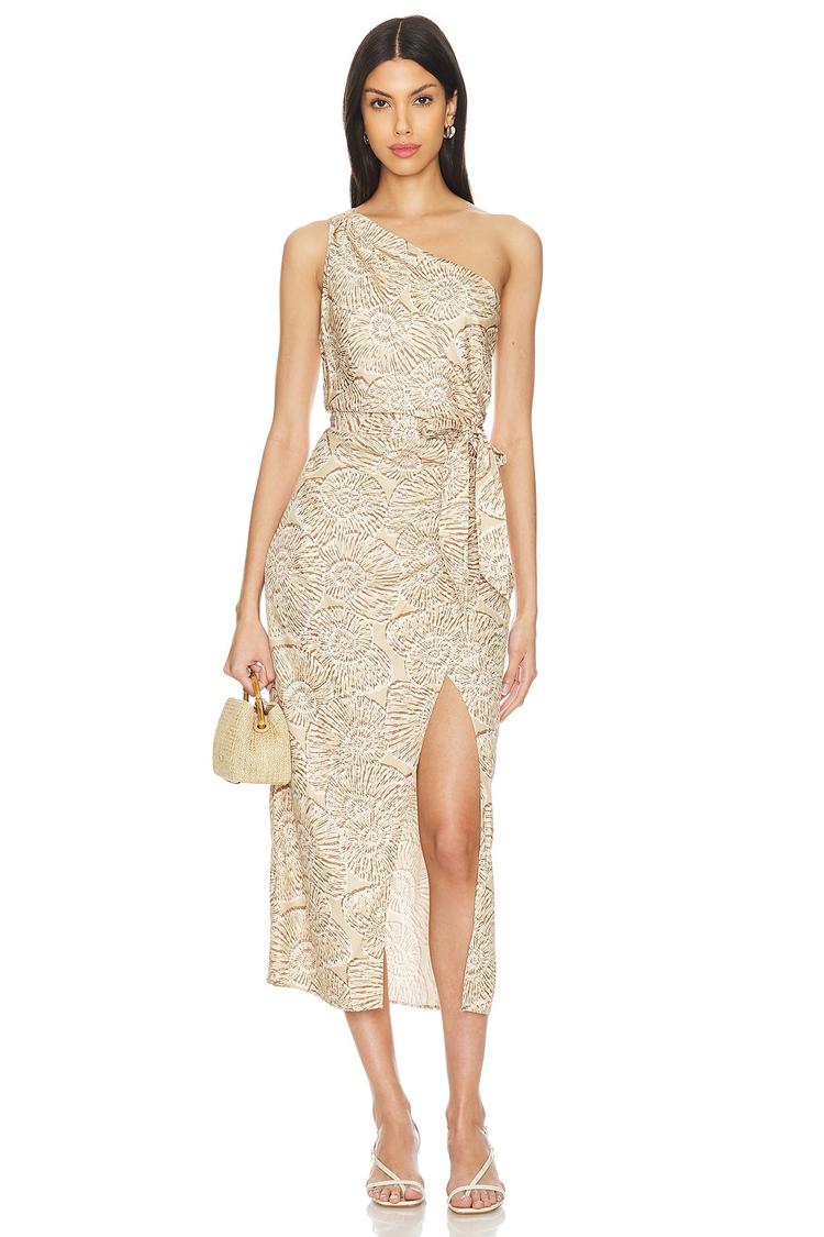 Soft linen crepe fabric and an asymmetric neckline create a sleek silhouette with a fitted slip dress design. The midi length and side slit add subtle allure, complemented by a delicate waist tie ribbon that enhances the waistline. Ideal for spring and summer occasions, this minimalist and elegant piece suits cocktail parties, brunches, and romantic date nights with ease. The concealed side zipper ensures a smooth, flattering fit while the abstract pattern adds visual interest in a muted beige tone.