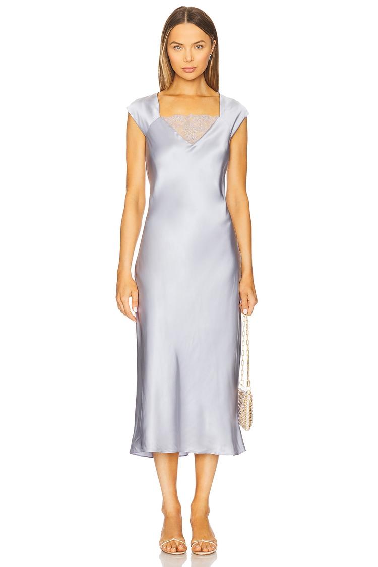 Shimmering light silver silk blends with midweight satin fabric to create a sleek midi slip dress featuring elegant lace trim at the V-neckline. The slim fit and wide strap sleeveless design offer a sophisticated silhouette that glides gracefully, perfect for cocktail parties, date nights, or formal brunches. Fully lined with viscose for comfort, this minimalist piece embodies timeless elegance with effortless pull-on styling and a clean hemline.