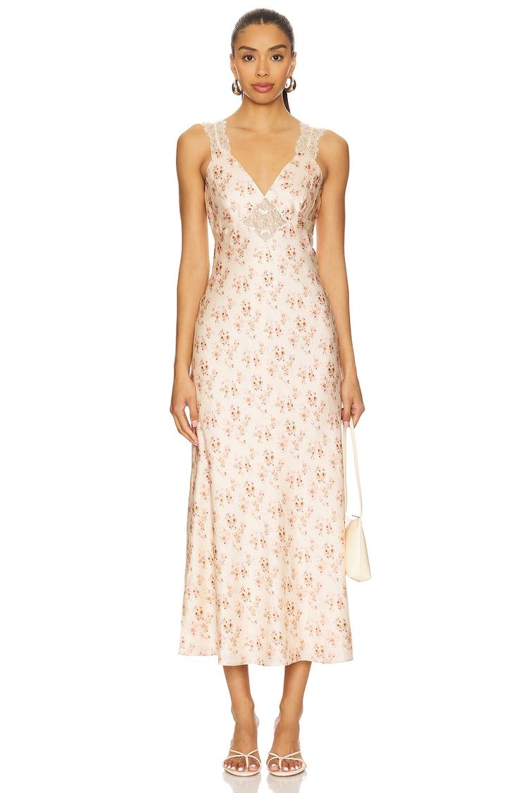 Soft matte ivory silk forms the base of this elegant slip dress, embellished with delicate blush and rose floral patterns all over. The slim silhouette and midi length enhance a graceful figure, complemented by a flattering V-neckline and slender spaghetti straps with lace trim at the front and shoulders. A concealed back zipper ensures a seamless finish, while the fully lined satin fabric lends a comfortable, midweight feel. Ideal for spring and summer, this dress suits refined occasions like brunch, cocktail parties, or romantic date nights with timeless sophistication.