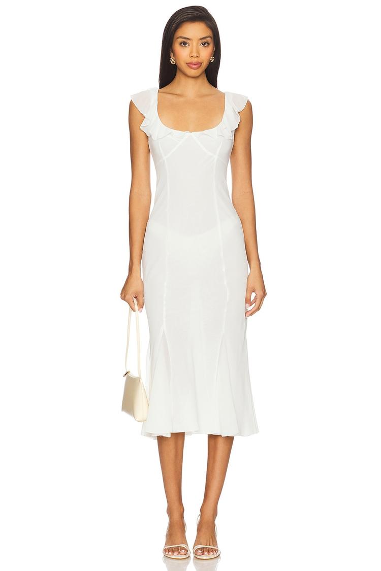 Soft georgette fabric and a fitted silhouette combine to create a graceful midi dress perfect for spring and summer occasions. Featuring a square neckline and delicate ruffled shoulder straps, this dress flows elegantly with a clean hemline and a hidden back zip with button loop closure. Its sheer texture adds a modern touch, ideal for brunch, date nights, or cocktail events where effortless sophistication shines.