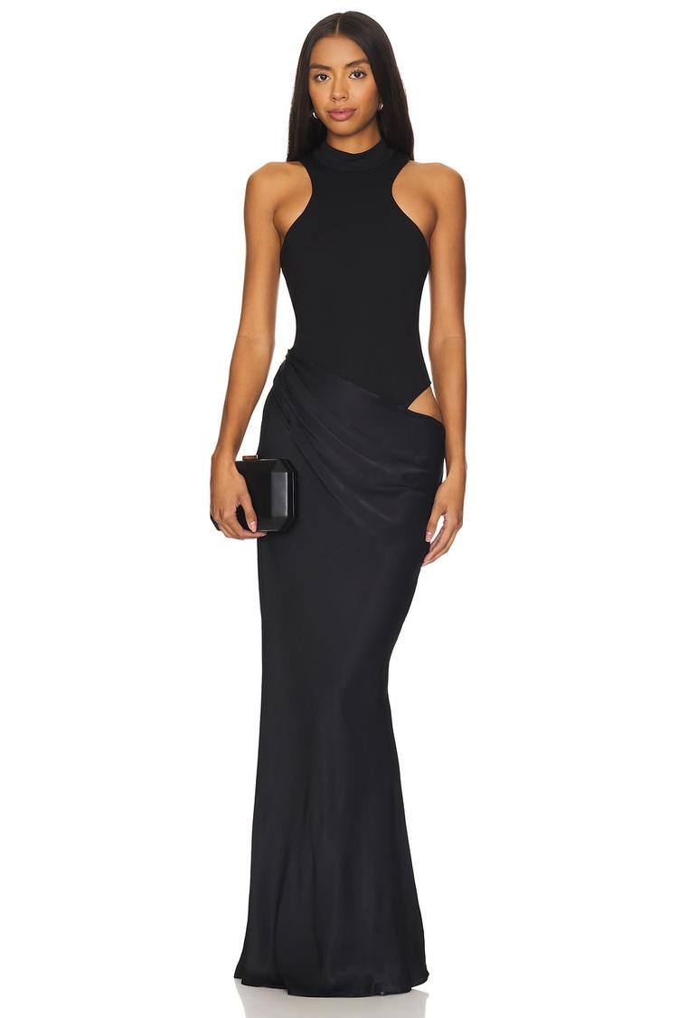 A sleek matte black silhouette with a high neckline and sleeveless design defines this Estrella Maxi Dress. The fitted ponte bodysuit with hidden back zipper and snap button gusset offers a smooth, contoured fit, while the detachable satin skirt adds versatile elegance. The floor-length hemline and side cutouts create a striking, modern appeal, perfect for cocktail evenings, formal events, or sophisticated date nights. Crafted from a viscose, nylon, and elastane blend, this dress combines comfort with refined style for all-weather wear.