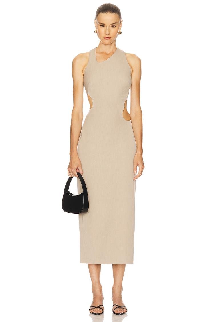 A sleek beige sheath silhouette with a high neckline and sleeveless design creates a modern, elegant look. This midi dress features striking side cut-outs that add a sophisticated edge while maintaining a fitted shape through lightweight suiting fabric. The concealed back zipper and a back vent enhance both style and comfort, making it an ideal choice for cocktail parties, date nights, or upscale evenings out. Crafted from a polyester-viscose blend, this dress promises a smooth, flattering fit with subtle stretch for ease of wear.