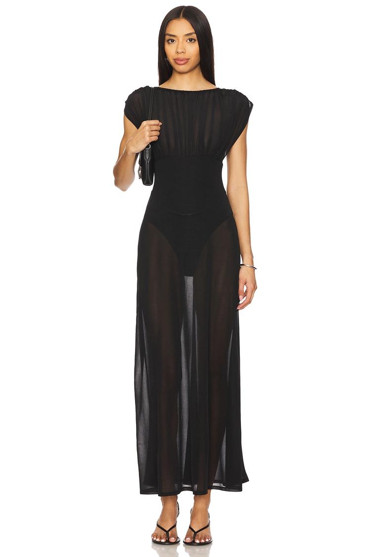 Sleek and sophisticated, this matte black sheath dress features a flattering fitted silhouette with cap sleeves and a round neckline. The maxi length and clean hemline extend elegance, while the sheer mesh fabric adds a modern, sexy edge with subtle transparency. A keyhole back secured by hook and snap closures enhances the alluring design. Crafted from polyester, elastane, and mesh, it offers stretch and structure for comfortable wear. Ideal for date nights, cocktail parties, or evening outings, this dress embodies contemporary glamour with a daring twist.