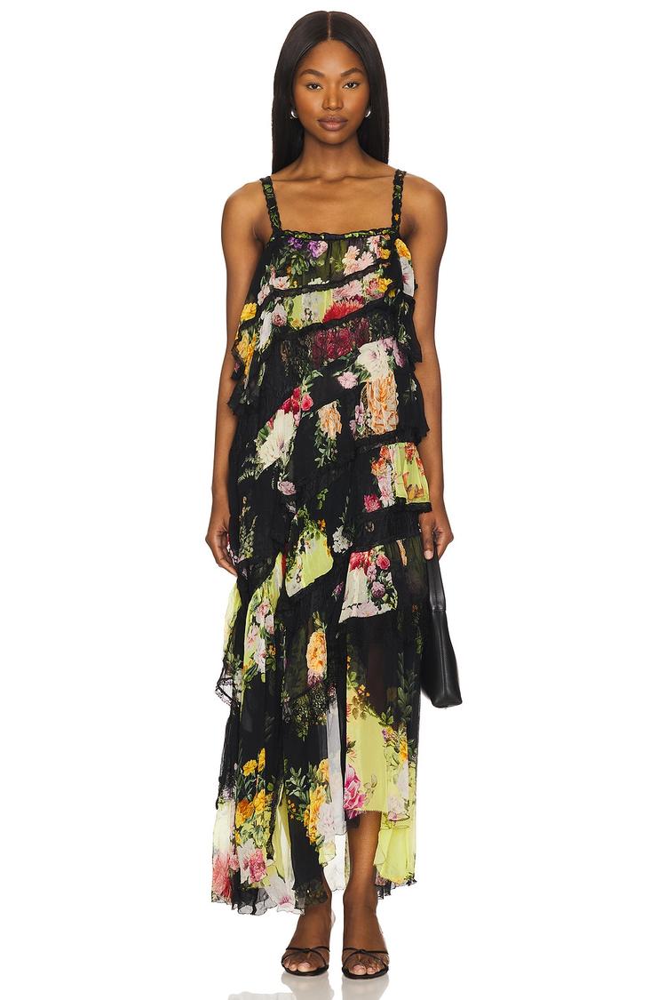 Delicate chiffon and silk fabrics blend effortlessly in this asymmetric slip dress featuring intricate lace trim and romantic ruffles. The flowing maxi length and straight neckline create an elegant silhouette, while spaghetti straps add a graceful touch. Floral patterns in vibrant hues of yellow, red, and pink contrast beautifully against the black base, making it a sophisticated choice for cocktail parties, formal events, and stylish brunches. Lightweight and fully lined, this dress offers comfort and allure for spring through autumn occasions.