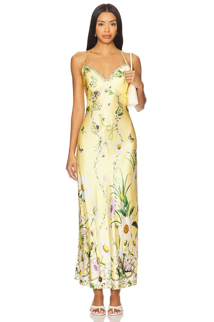 Soft charmeuse silk in a matte light yellow creates a delicate canvas for the all-over floral print, accented with subtle beaded detailing that adds a touch of sparkle. This maxi slip dress features a slim fit and a sweetheart neckline with spaghetti straps, perfectly complemented by an open back with a hook closure for an elegant finish. Ideal for spring and summer soirées, it blends sophistication with ease for cocktail parties, date nights, or girls' night outs.