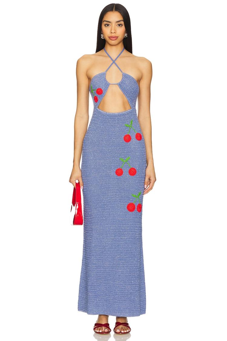 Soft knit cotton fabric forms a slim, maxi-length slip dress with a halter neck and tie-back closure, creating a flattering silhouette. Crocheted cherry appliques in vivid red and green add playful charm to the matte blue base. The clean hemline enhances its sleek profile, perfect for spring and summer outings. Ideal for casual beach days, vacation escapes, brunches, or romantic date nights, this Capittana Pipa Dress balances bohemian vibes with casual chic elegance for versatile warm-weather style.