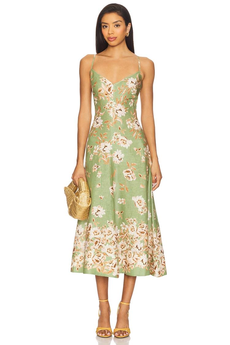 Soft matte light green linen with an all-over delicate floral print sets a romantic tone for this slim-fitting midi slip dress. Adjustable spaghetti straps and a sweetheart neckline enhance its minimalist elegance, while the concealed back zipper ensures a seamless finish. Perfect for spring and summer brunches, vacation getaways, or charming date nights, this breathable linen piece combines classic style with effortless comfort.