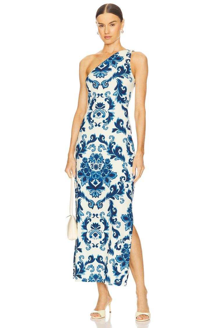 An elegant asymmetric neckline paired with a sleek column silhouette defines this maxi dress, crafted from a midweight viscose blend with a hint of elastane for comfort. The blue baroque pattern on a crisp white base creates a timeless look, enhanced by side slits that add movement and allure. Ideal for spring and summer evenings, it transitions seamlessly from cocktail parties to date nights and sophisticated night outs. The pull-on slip-on style and sleeveless design make it effortless to wear while maintaining a chic and polished appearance.