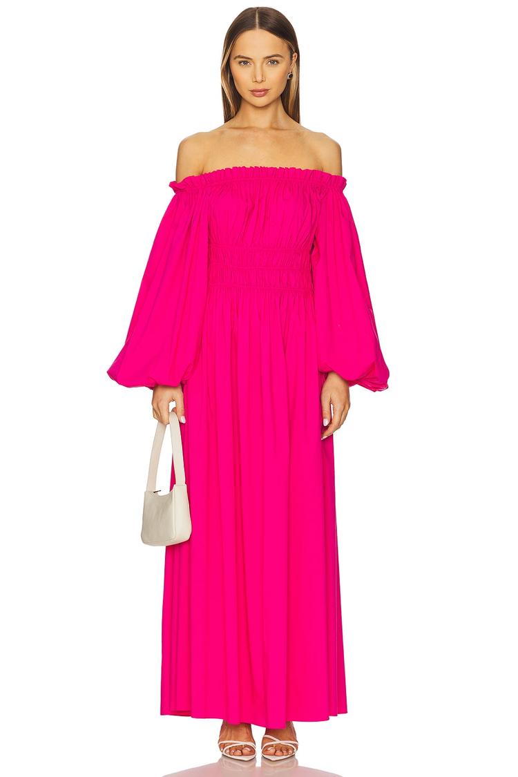 Bright pink cotton blend fabric and a flowing maxi length define this off-shoulder shift silhouette. The smocked bodice adds texture and shape, while voluminous balloon sleeves bring a romantic, bohemian vibe. Its loose fit and side slit pockets combine comfort and practicality, perfect for spring and summer occasions like brunch, casual outings, or date nights. The clean hemline enhances its elegant yet relaxed look, making it an effortless choice for a chic, casual style.