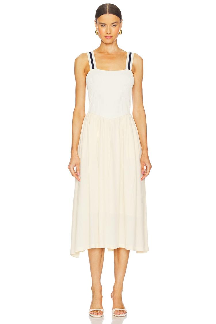 Soft cream hues and a ribbed knit bodice sculpt a flattering bodycon silhouette in this basque waist midi dress. The sleeveless design and square neckline offer timeless minimalism, ideal for warm spring and summer days. Crafted from a viscose blend with a smooth rayon lining, it delivers comfortable stretch and a sleek finish. Effortlessly versatile, this dress transitions from casual brunches to intimate date nights with ease, making it a refined staple for your seasonal wardrobe.