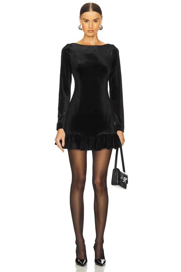 A sleek matte black velvet mini dress with a fitted silhouette and elegant square neckline perfect for autumn and winter evenings. The long sleeves and concealed back zipper ensure a polished fit, while subtle ruffled hemline details add a touch of feminine flair. Crafted from a lightweight polyester-spandex blend, this shift dress offers comfort and sophistication ideal for cocktail parties, date nights, or stylish night outs. Its timeless classic style makes it a versatile addition to your wardrobe for sophisticated seasonal occasions.