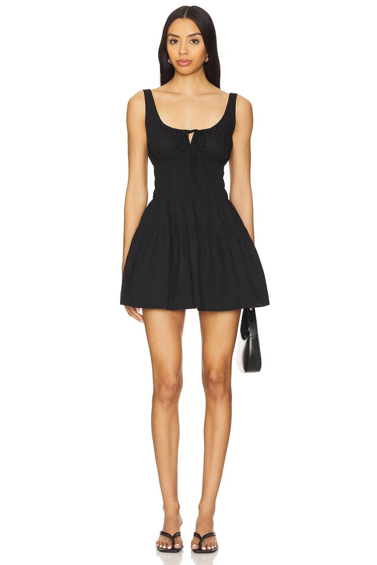 Lightweight cotton poplin and a relaxed babydoll silhouette create an effortlessly chic mini dress perfect for sunny days. Featuring wide straps, a flattering U-neckline, and a ruffled hemline, this black dress offers casual sophistication with side seam pockets adding practical charm. The cinched waist enhances the silhouette, making it ideal for brunches, casual outings, or date nights. Breathable fabric and sleeveless styling ensure comfort during warmer seasons, while the pullover design offers easy wearability. A versatile piece that combines classic design with modern casual chic.