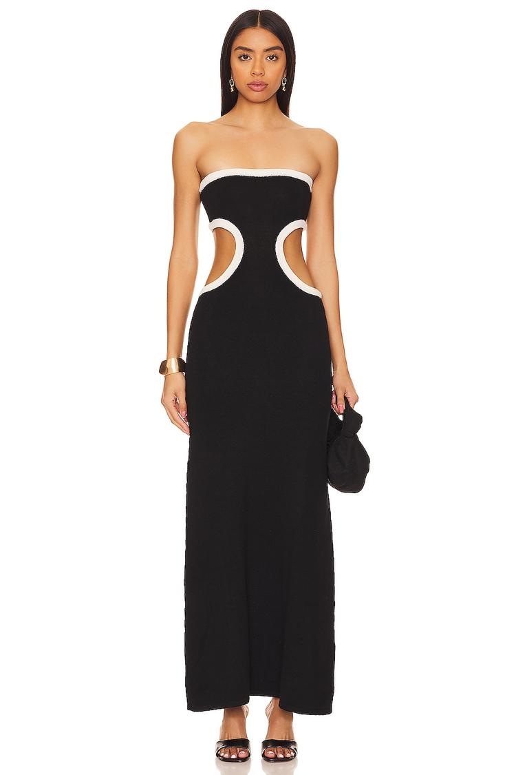 Sleek and sultry, this black empire waist maxi dress features striking white contrast trim and side cutouts that highlight the waist for a bold, bodycon fit. Crafted from a comfortable cotton-elastane terrycloth blend, it offers a pull-on style with a back vent slit hem for ease and movement. The strapless neckline and sleeveless silhouette create a minimalist yet sexy look perfect for cocktail parties, night outs, or stylish date nights. Its versatile design and midweight fabric make it suitable for various seasons and occasions.