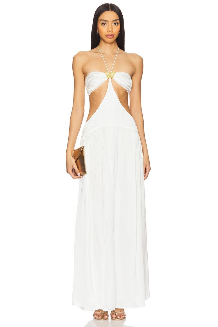 Soft viscose and a slim silhouette create an alluring profile with the Mila Butterfly Maxi Dress. Featuring a halter neck and tie-back closures, this sleeveless maxi boasts elegant side and back cut-outs for a bold statement. The subtly flounced hem adds graceful movement, while a detachable metallic gold butterfly charm at the bust lends a unique touch. Perfect for summer nights, cocktail events, or date nights, this dress combines sexy and elegant vibes in one versatile piece.