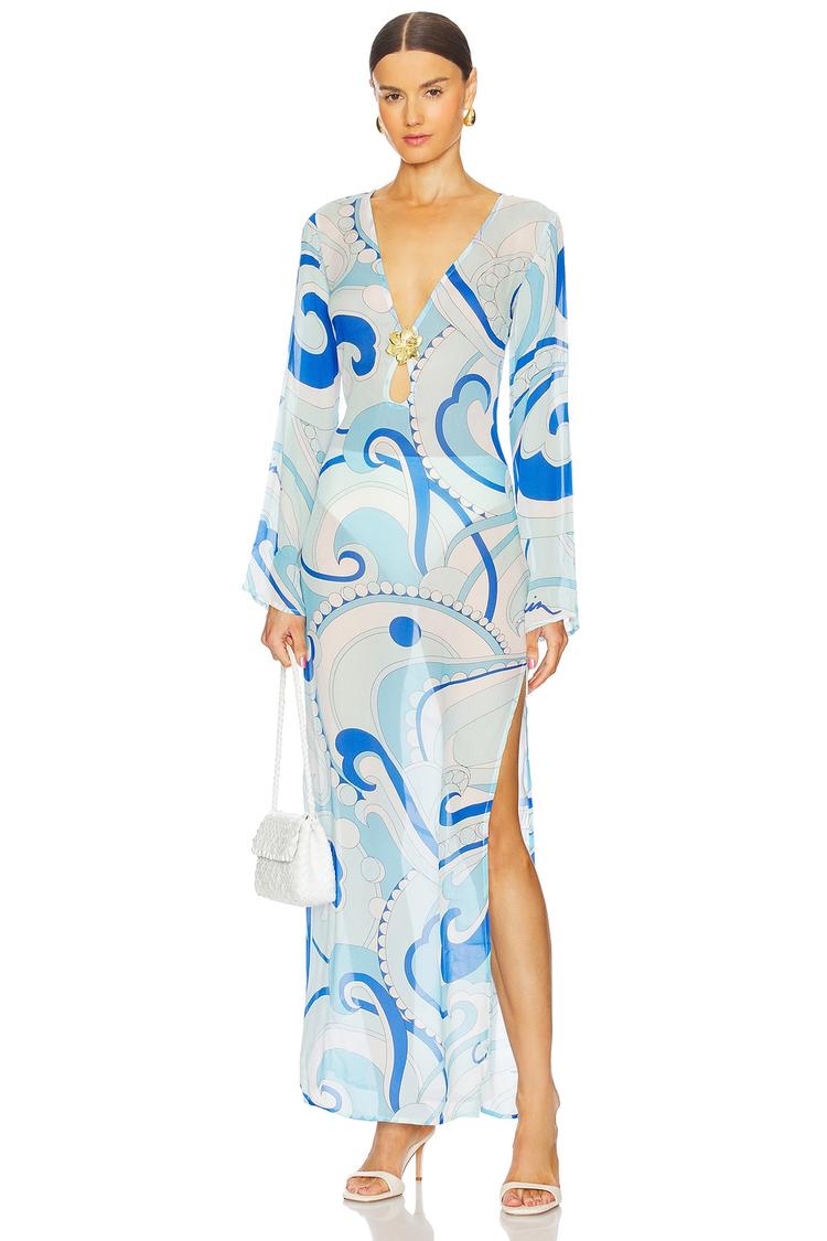Flowing in a sleek column silhouette, this maxi dress features a striking abstract pattern in soft blue and beige hues on a matte white base. Crafted from lightweight viscose jersey, it offers a slim fit with long sleeves and a flattering V-neckline. The clean hem and side slit add subtle allure, while the pull-on style ensures easy wear. Ideal for spring and summer, this elegant and chic dress suits brunches, date nights, and evening outings with effortless sophistication.