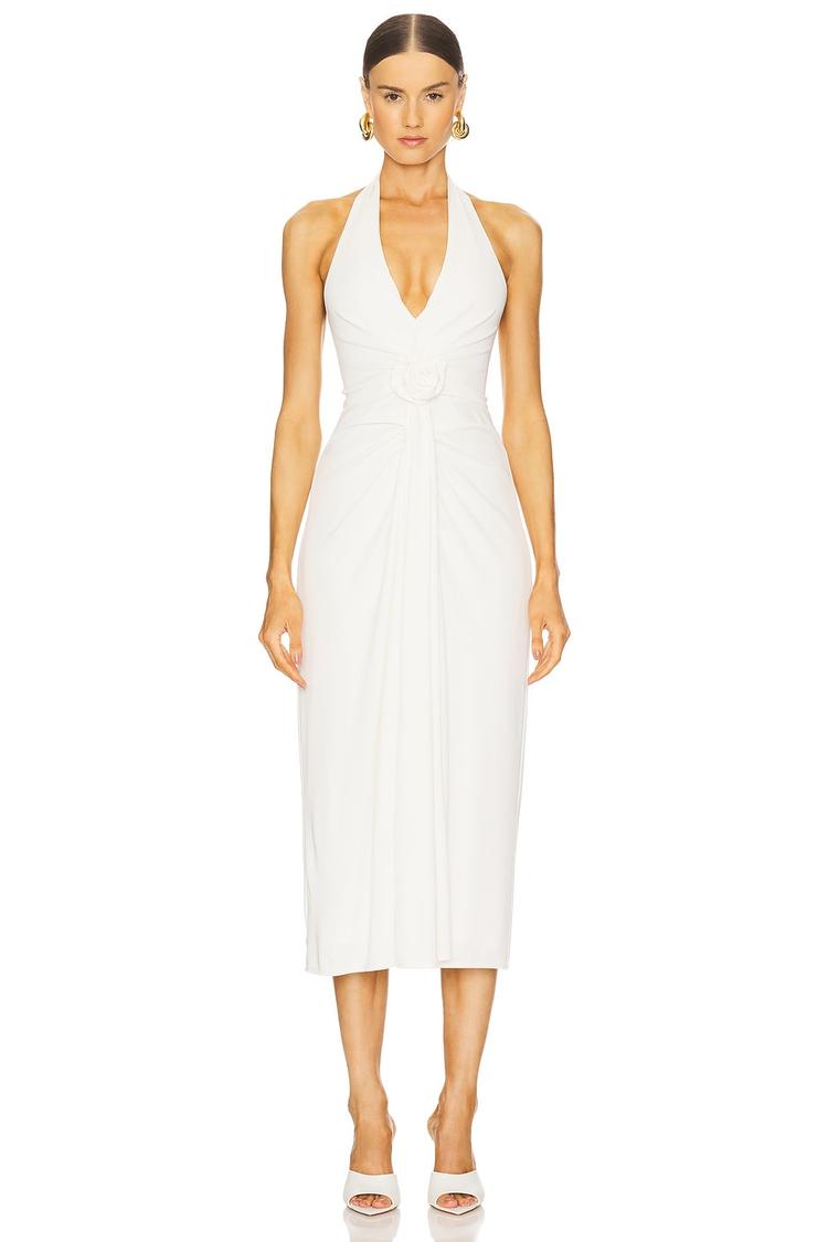Soft polyester blend fabric and a fitted slip dress silhouette create an elegant look with a halter neckline and open back. This midi-length dress features a clean hemline and a subtle floral applique accent on the front, adding sophisticated detail without overwhelming the minimalist design. Ideal for spring and summer events, it suits cocktail parties, date nights, and brunch occasions with ease, combining comfort and style with its stretch fabric and refined finish.