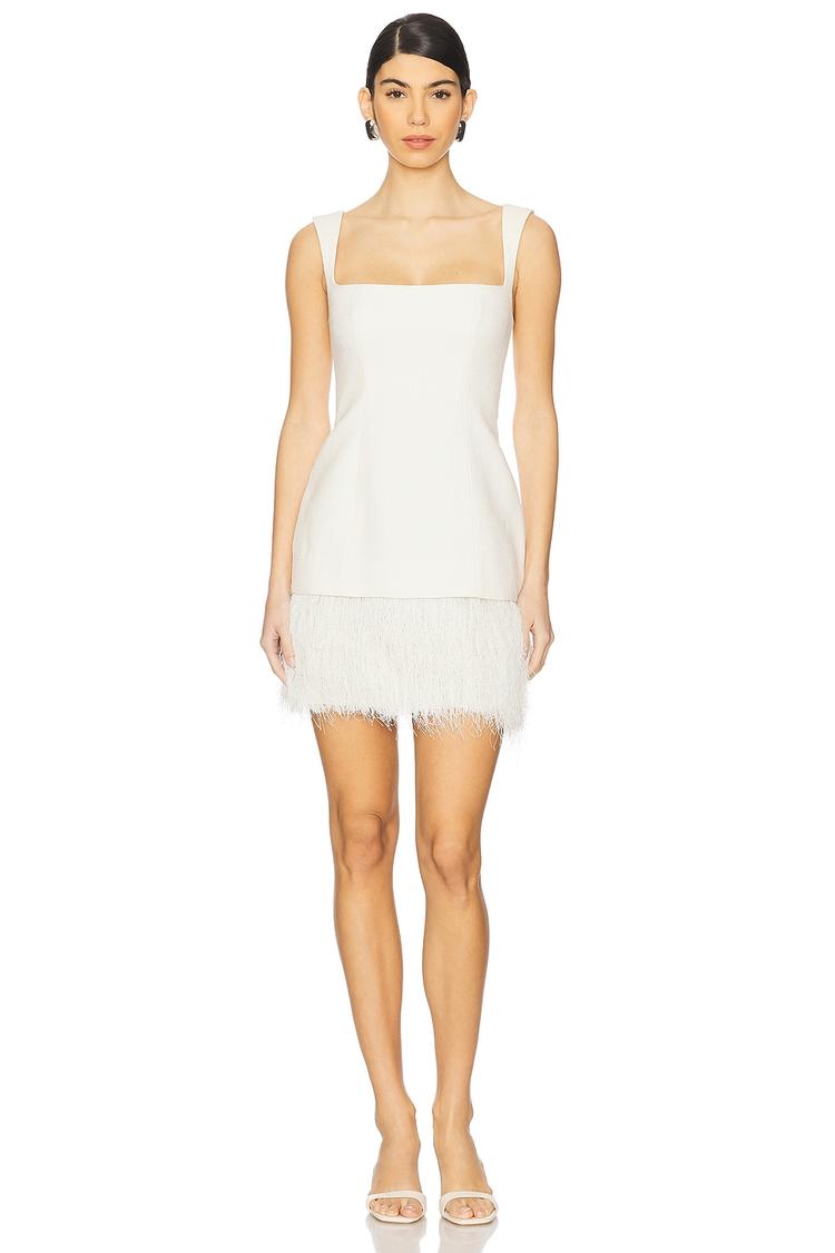 A chic white crepe mini dress featuring a sleek shift silhouette and a flattering square neckline. The sleeveless design with wide straps enhances its modern, sophisticated vibe, while the fringed hem adds playful movement and texture. Perfectly tailored in a slim fit, this lightweight dress is ideal for spring and summer evenings. Its concealed back zipper ensures a smooth finish, making it a versatile choice for cocktail parties, night outs, or date nights. Fully lined for comfort, this elegant piece balances simplicity with standout details effortlessly.