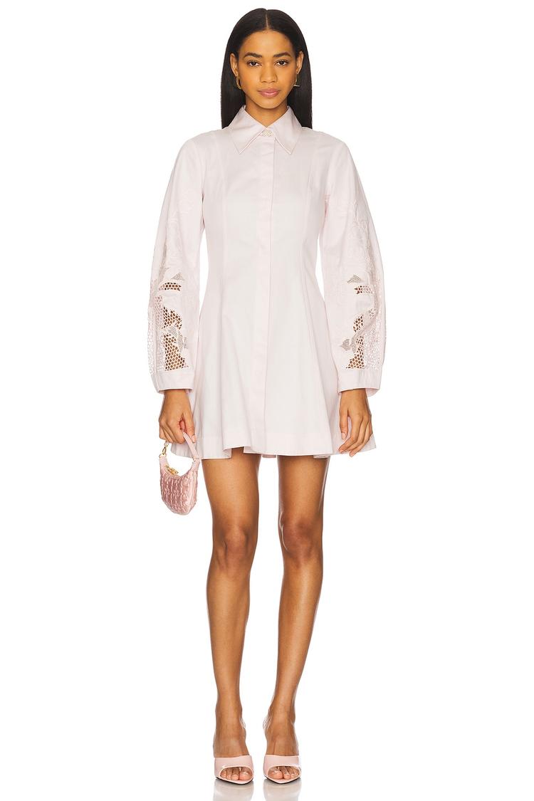 Midweight poplin cotton blends with delicate floral embroidery and cut-out mesh detailing on the sleeves create an elegant yet casual mini shirt dress. Featuring a classic shawl collar and long regular sleeves, the front button closure adds timeless charm. The clean hemline and regular fit enhance its modern silhouette, perfect for spring and summer brunches, casual workwear, or relaxed date nights. This versatile piece offers breathable comfort with a subtle feminine touch, making it a standout choice for multiple occasions.