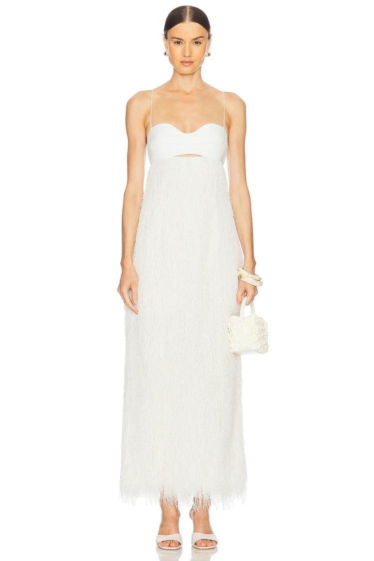 Soft white linen blend fabric with delicate fringe detailing along the hem creates a timeless and elegant sheath silhouette. The fitted maxi length dress features a strapless sweetheart neckline and a concealed back zipper with a hook and eye closure for a seamless finish. Fully lined with a smooth viscose-polyester blend, this dress offers both comfort and sophistication. Ideal for spring and summer formal occasions, cocktail parties, or romantic date nights, it exudes classic charm with modern design details.