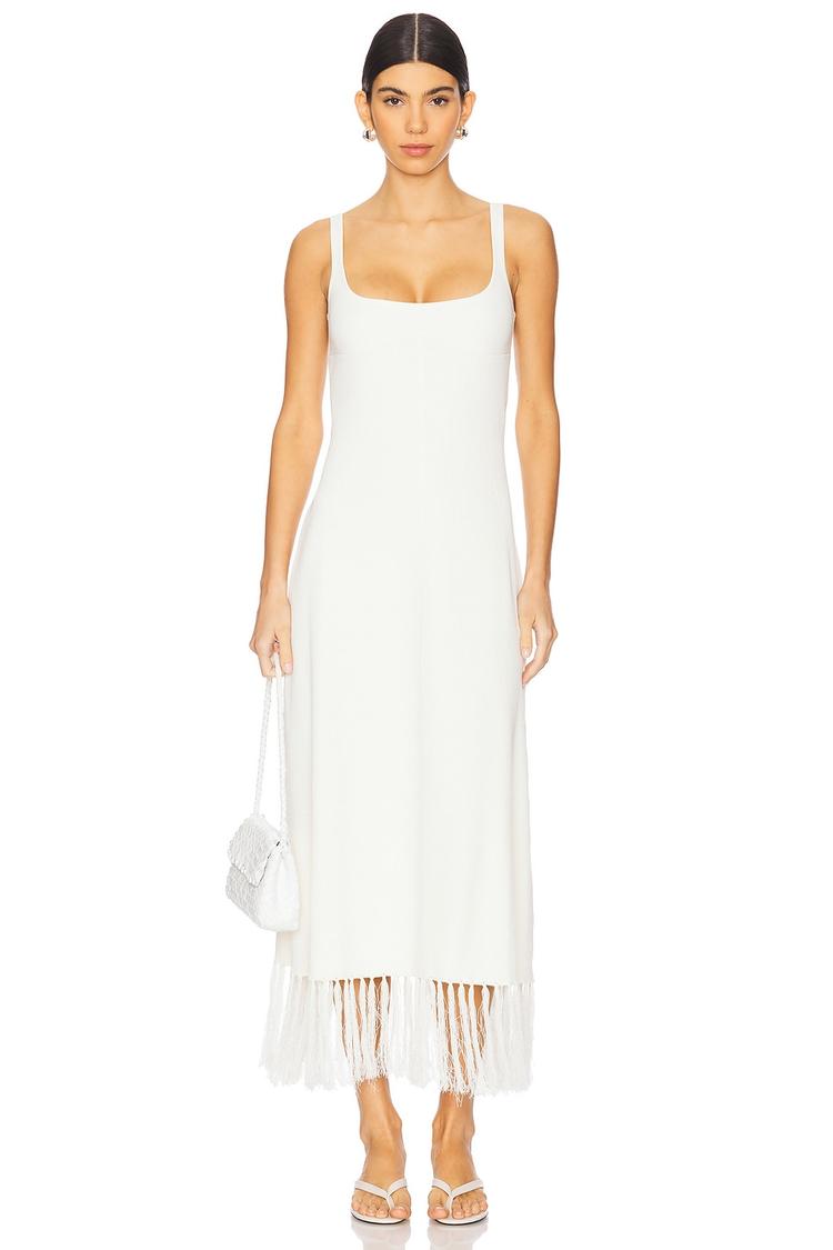 A heavyweight ribbed knit fabric brings texture and substance to this white slip dress, featuring a sleek slim fit and a flattering square neckline. The midi length is elevated by knotted fringe details along the hem, adding playful movement. With its sleeveless spaghetti straps and pull-on styling, this minimalist dress is ideal for spring and summer days, perfect for casual outings, brunches, or romantic date nights. The combination of viscose and nylon ensures comfortable wearability with a sophisticated edge.