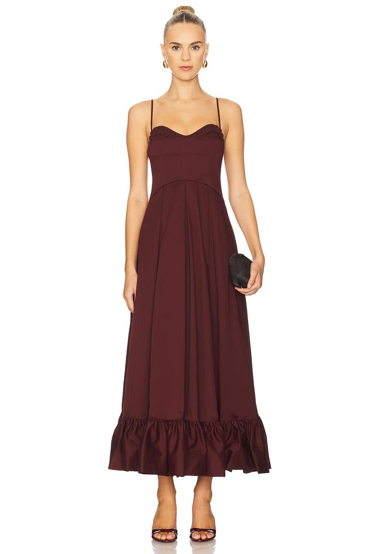 A matte burgundy A-Line midi dress with a fitted silhouette showcases a romantic sweetheart neckline and adjustable shoulder straps for a perfect fit. The square covered back features a concealed zipper closure, while the inverted curve drop waist flows into a flounce hem with ruffled detailing. Crafted from a blend of cotton, polyester, and viscose, this elegant dress suits cocktail parties, formal events, and date nights with timeless charm and refined style.