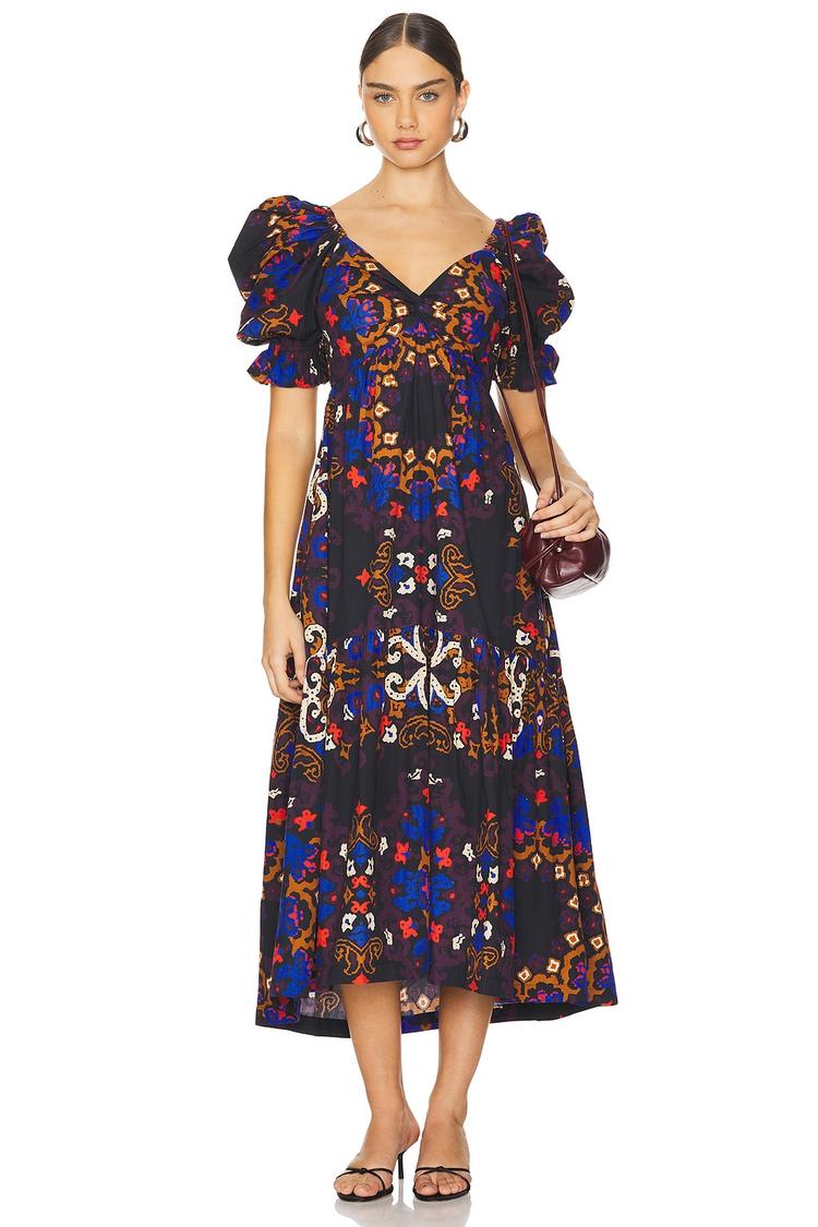 This ankle-length A-Line dress showcases a vibrant abstract pattern in bright blue, orange, and white against a matte black base. Crafted from lightweight cotton poplin, it features a relaxed fit with smocked side panels and ruffled puff half sleeves that add romantic volume. The V-neckline and concealed back zipper ensure a flattering silhouette, while side seam pockets provide practical charm. Ideal for spring through autumn wear, this Bohemian-inspired piece suits casual outings, brunches, and date nights with effortless style.