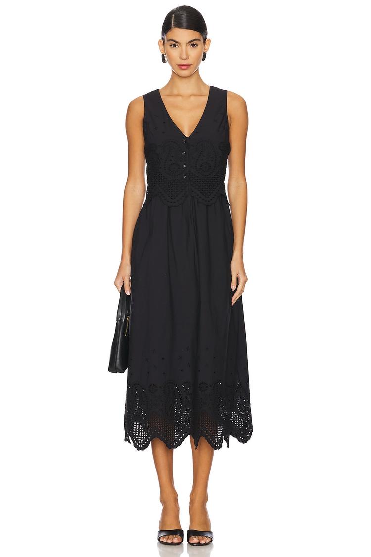 Soft organic cotton and a flattering A-Line silhouette define this matte black midi dress, featuring delicate embroidery across the bodice and skirt. The V-neck and wide straps enhance its classic appeal, while the scalloped, ruffled hem adds a whimsical touch. Practical side seam pockets and a front button closure complete the design. Ideal for casual outings, brunches, and date nights, this breathable, midweight eyelet fabric dress offers comfort and style throughout spring, summer, and autumn.
