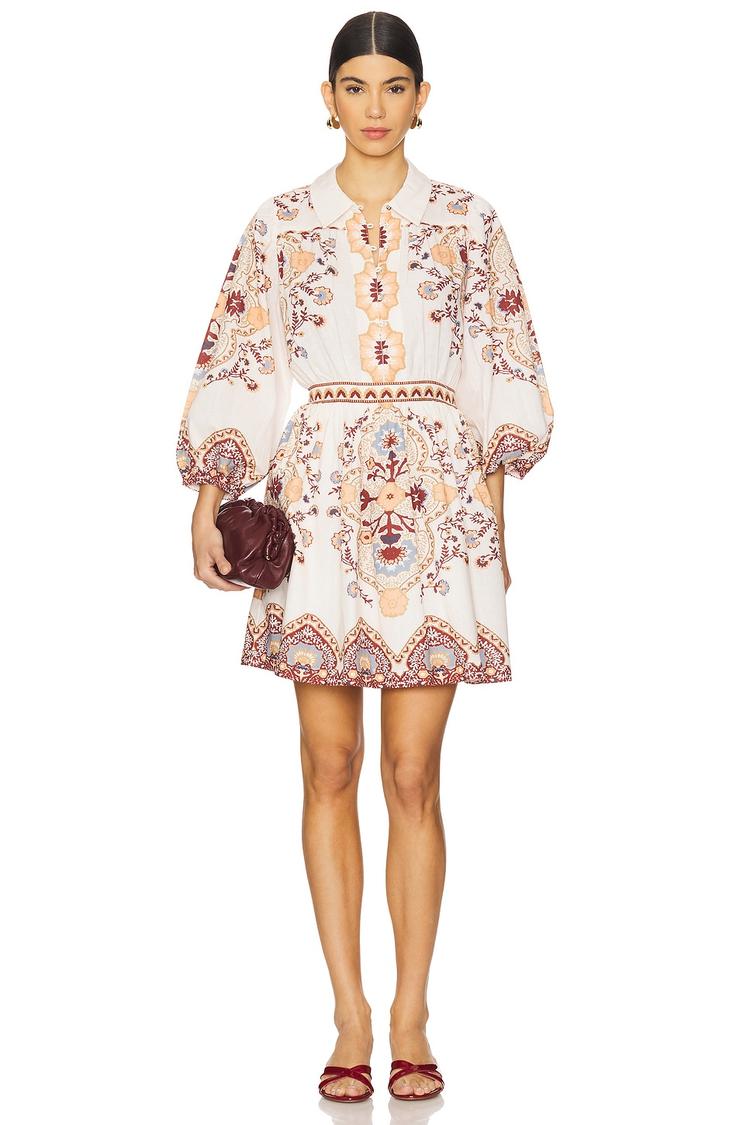 Soft heavyweight cotton-linen blend fabric and a loose shift silhouette come together in this off-white mini dress adorned with an all-over floral print in warm beige, brown, pink, and red tones. The round neckline and long balloon sleeves enhance its romantic, bohemian vibe, while ruffled hems add charming detail. Functional side pockets and a hidden side zip with partial front button loops provide convenience. Ideal for spring and summer occasions, this dress is perfect for casual outings, brunch dates, or vacation style.