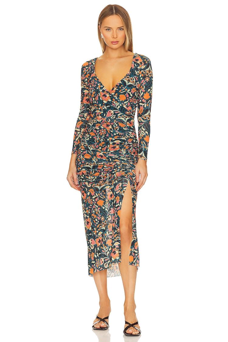 Ruched mesh fabric and a surplice neckline shape a figure-flattering sheath silhouette in this midi dress. The long sleeves and hidden side zipper add refined detail, while the floral print in muted pinks, greens, and beige on a black base delivers romantic bohemian charm. Partially lined with cotton, the breathable mesh fabric offers a sheer, textured finish with a side slit hemline for graceful movement. Ideal for spring and summer nights, this dress suits cocktail parties, date nights, or stylish evening outings with effortless sophistication.