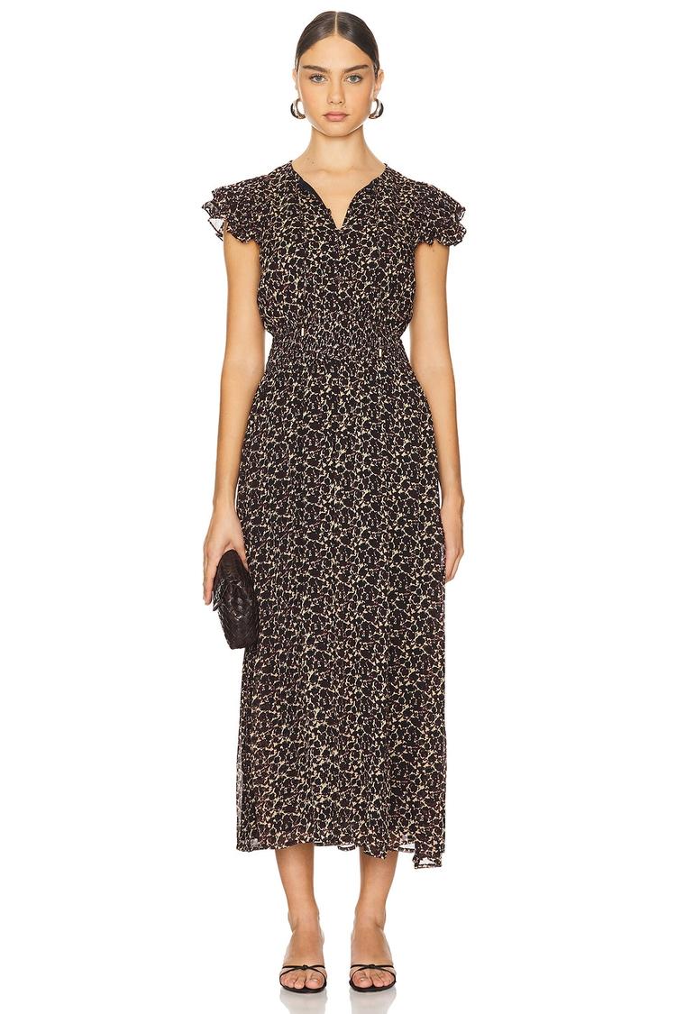 Lightweight chiffon and a flowing midi hem create a graceful silhouette in this ankle dress. The comfort-fit elasticized waist and flutter sleeves add delicate movement, while the V-neckline enhances its romantic elegance. Featuring an all-over floral print in muted beige and brown tones on a black base, this dress is perfect for spring and summer occasions like brunch, date nights, or cocktail events. Its partial front loop button closure and full lining ensure a polished finish for versatile wear.