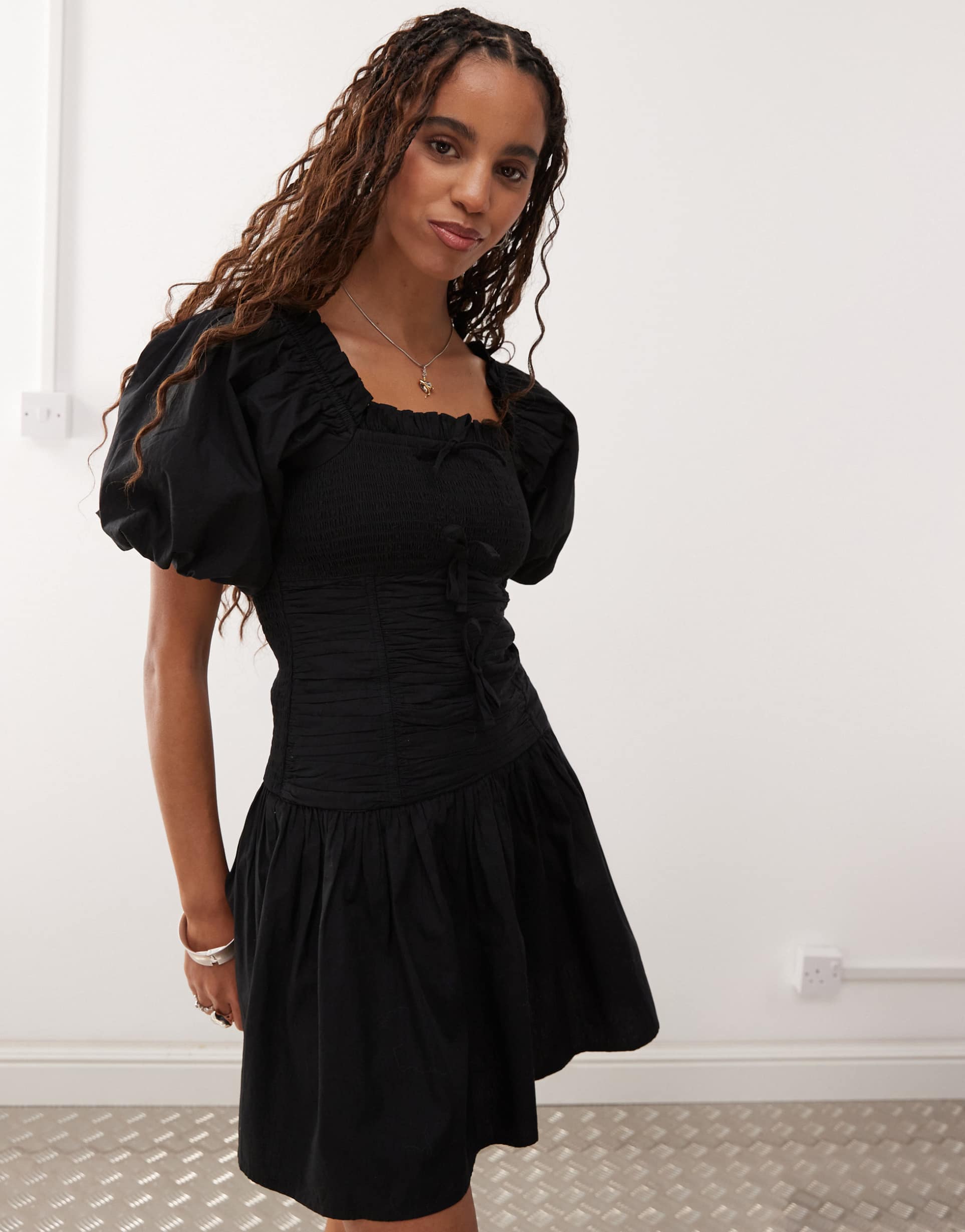 Soft cotton fabric and a babydoll silhouette define this black mini dress featuring a flattering square neckline and voluminous puffed half sleeves. The front tie-up and shirred stretch panels add charming ruching details that enhance the casual chic vibe. Ideal for warm spring and summer days, this regular fit dress pairs effortlessly with brunch dates, casual outings, or relaxed evenings. Its ruffled hemline adds playful movement, making it a cute and versatile choice for everyday style and date nights alike.