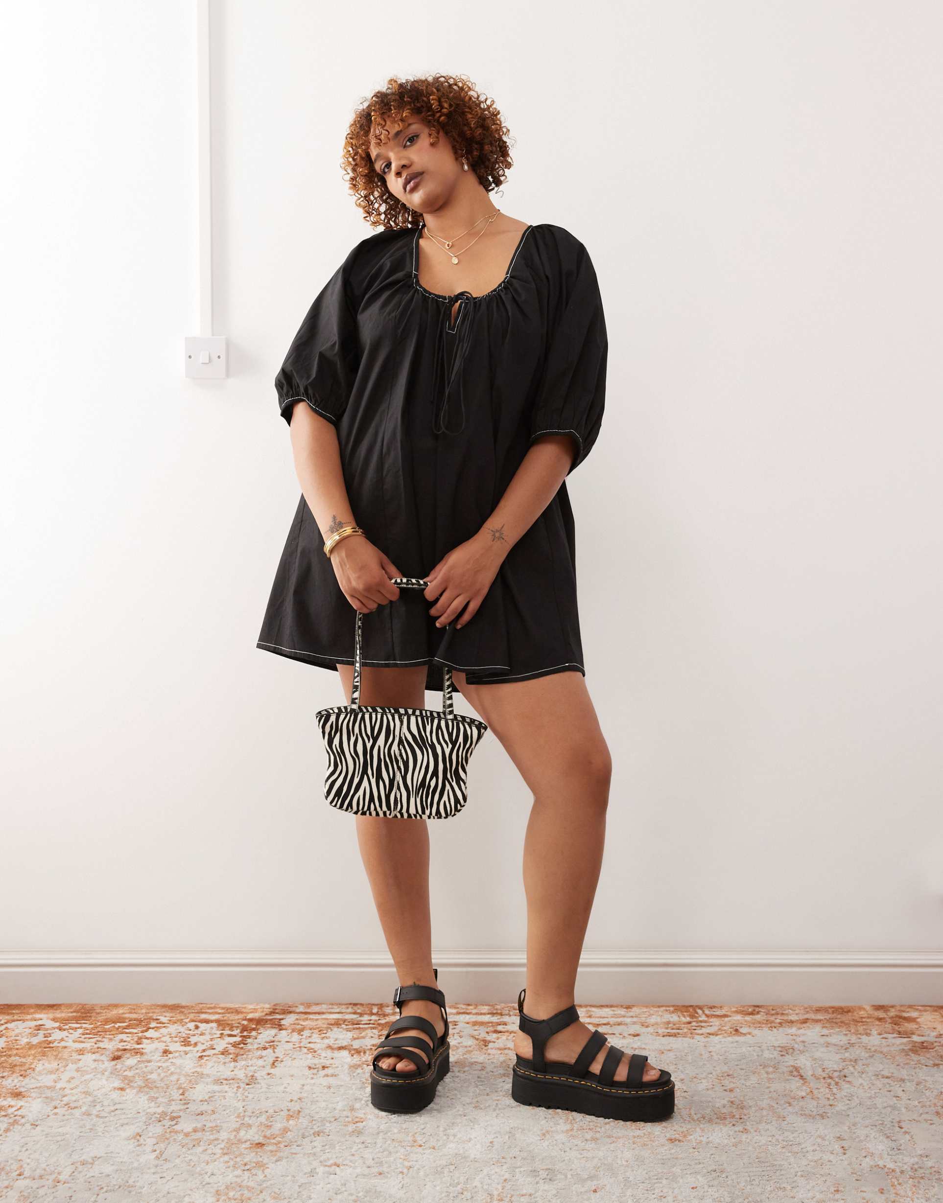 COLLUSION PLUS PUFF SLEEVE MINI SMOCK SWING DRESS IN BLACK
