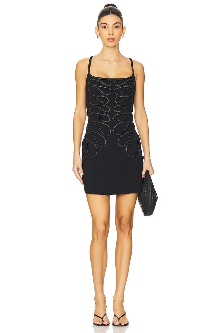 A sleek matte black sheath dress crafted from a midweight knit blend of viscose, nylon, polyester, and cotton offers a fitted mini silhouette perfect for date nights and cocktail events. The square neckline and spaghetti straps enhance its modern, sexy appeal, while criss-cross back detailing and raffia ribbon accents on the bodice add subtle texture and interest. Designed with a concealed side zipper and hook closure, this chic piece transitions effortlessly from a night out to sophisticated gatherings with ease.