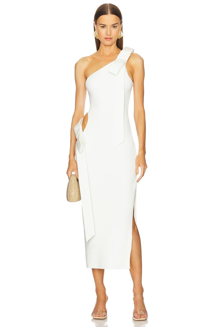 An elegant asymmetric neckline and sleek column silhouette define this white midi dress crafted from a ponte blend of polyester, nylon, and spandex for a fitted yet comfortable feel. The sleeveless, strapless design features eye-catching cut-out details and bow accents on the side, complemented by a subtle side slit hemline that adds movement and sophistication. This modern piece is perfect for cocktail events, date nights, or stylish evening outings where effortless sophistication and a contemporary edge are essential.