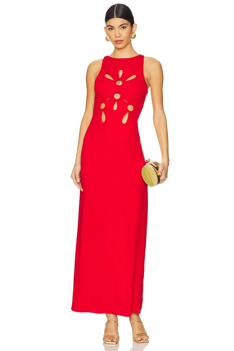Sleek and striking, this slim-fitting column gown in vibrant red features a high neckline and sleeveless wide straps for a modern silhouette. Crafted from heavyweight viscose ponte fabric, it offers a smooth, structured feel perfect for formal occasions. The front cut-out design adds a bold, elegant statement, while the covered back with a hidden zipper and back vent ensures comfort and ease. Ideal for cocktail parties, semi-formal events, or sophisticated evenings, this gown balances timeless elegance with contemporary edge.