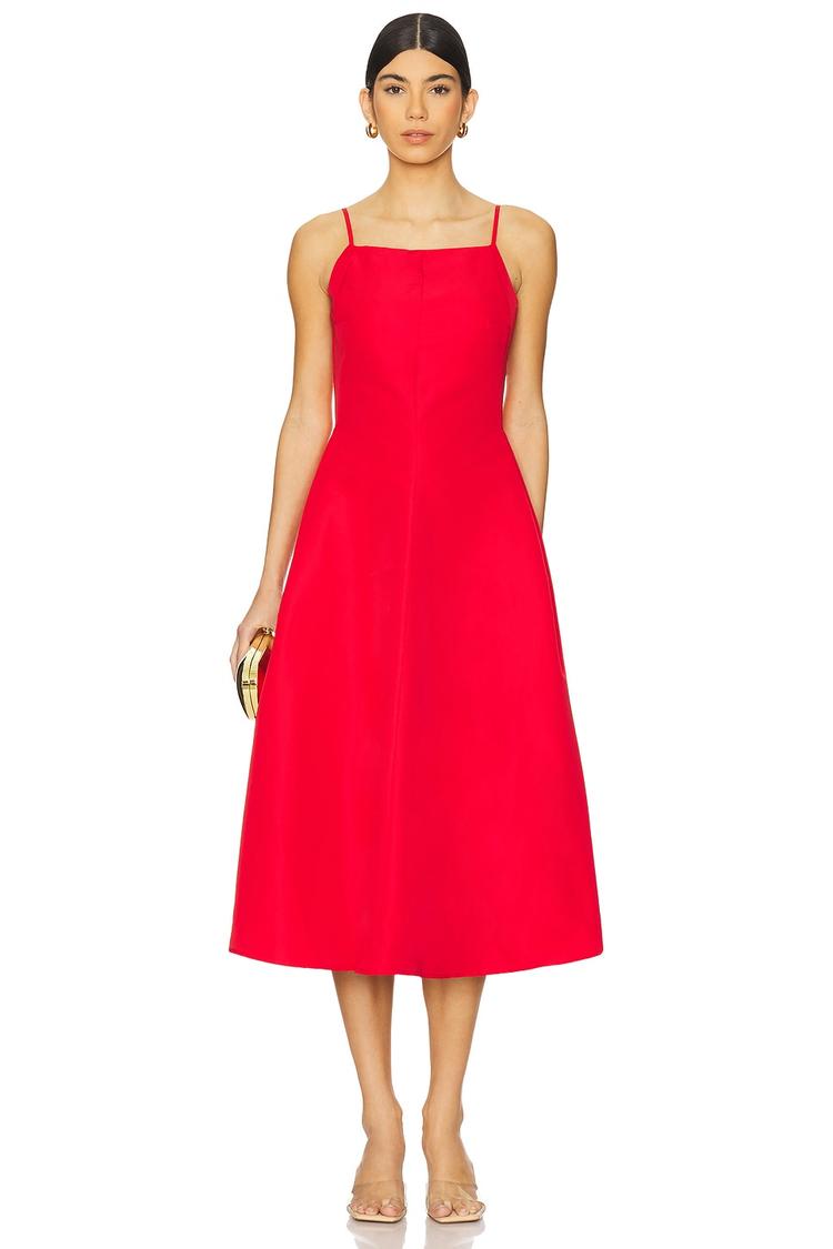 Bright red structured bengaline fabric shapes a fitted bodice with a straight neckline and delicate spaghetti straps, flowing into a flared waist and a clean midi hemline. The concealed back zipper and fully lined polyester-elastane blend enhance comfort and style. This classic and elegant silhouette suits spring, summer, and autumn events, making it ideal for cocktail parties, date nights, and wedding guests. The vibrant solid color combined with the fit and flare design creates a timeless look that transitions effortlessly from day to evening occasions.
