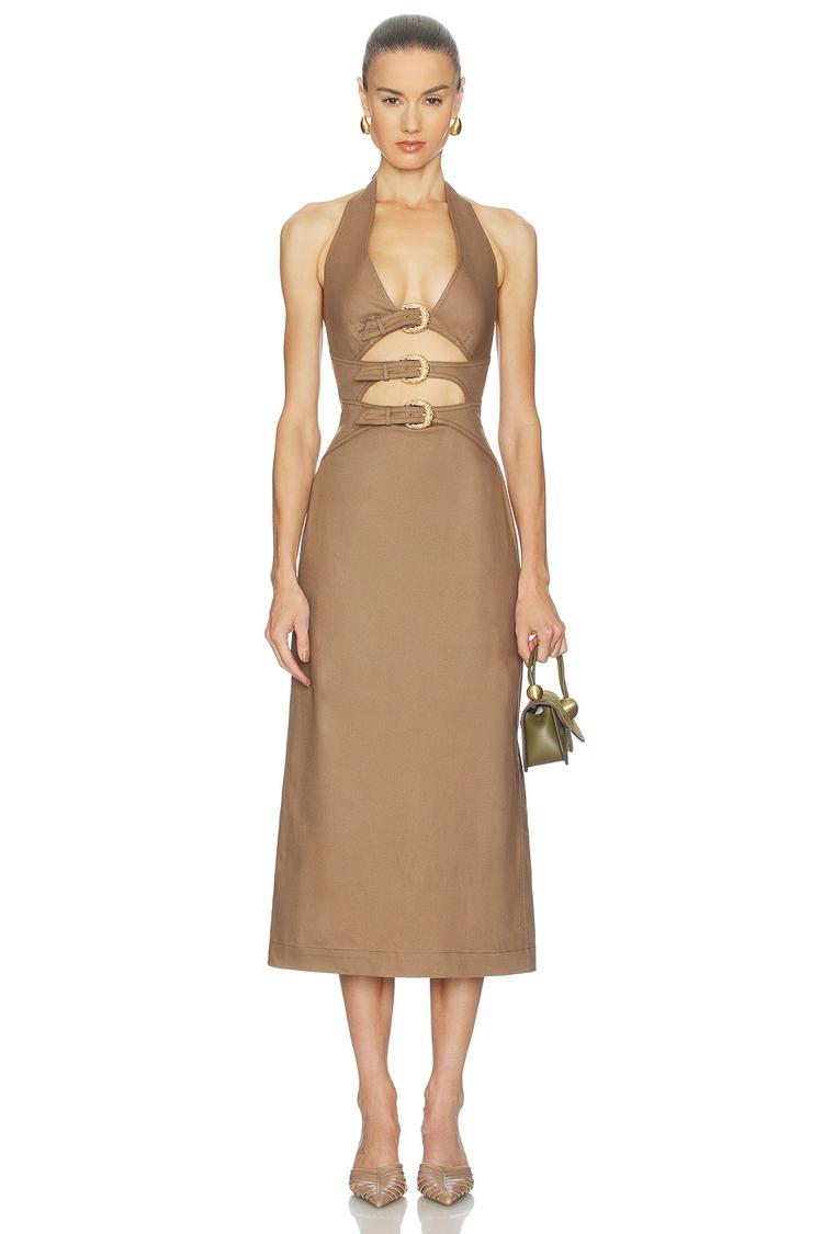 A sleek silhouette meets warm matte brown cotton twill in this halter-neck sheath dress, featuring a fitted shape and mid-length hem that flatters the figure. Gold-tone brass buckles at the front add a striking modern edge, while the back zip closure ensures a streamlined fit. Perfect for spring and summer evenings, this dress transitions effortlessly from date nights to cocktail parties and night outs. The sleeveless design and breathable fabric make it a chic choice for warm-weather occasions that demand both elegance and subtle sexiness.