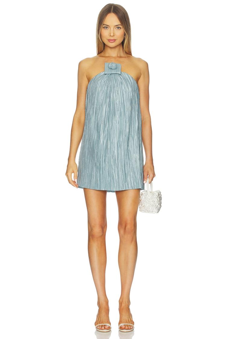 Shimmering light blue chiffon forms a flowing mini shift silhouette that flatters with a regular fit and sleeveless strapless design. The high neckline features a delicate front knot accent, adding a chic bow detail to the front bodice. Midweight polyester fabric with partial lining at the bust ensures comfort and structure. A hidden side zipper keeps the clean back seamless. Ideal for cocktail events, night outs, and date nights during spring and summer, this elegant modern dress blends subtle glamour with effortless style.