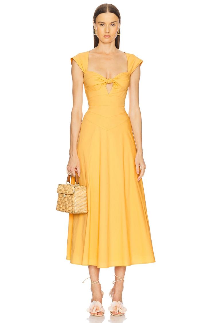 Sunlit gatherings and elegant evenings come alive with this matte yellow fit and flare dress crafted from midweight poplin cotton blend fabric. Featuring a sweetheart neckline and cap sleeves, the dress offers a fitted silhouette with a flattering boned bodice and a front knot accent that creates a subtle cut-out detail. Its midi length and clean hemline enhance the classic romantic vibe, making it ideal for brunch, date night, or cocktail occasions. The concealed back zipper and hook closure ensure a sleek finish, while the fully lined construction provides comfort and structure.