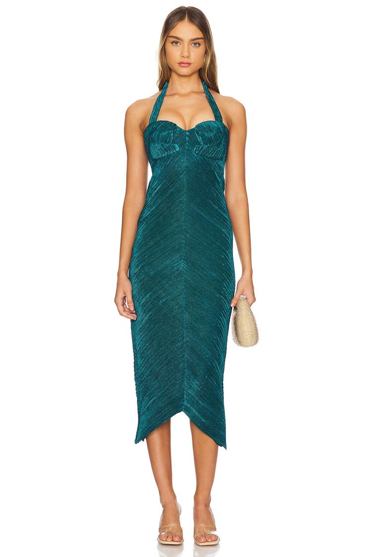 Draped in a rich matte teal, this halter-neck sheath dress features a fitted silhouette that enhances the natural curves with a padded bust and spiraling drape details. The invisible back zipper and halterneck tie closure add subtle sophistication, while the asymmetric midi hem provides a modern edge. Crafted from a polyester-elastane blend, it offers comfort and stretch, perfect for cocktail parties, date nights, or elegant evenings out. Fully lined and dry clean only, this dress combines timeless elegance with contemporary style for versatile all-weather wear.