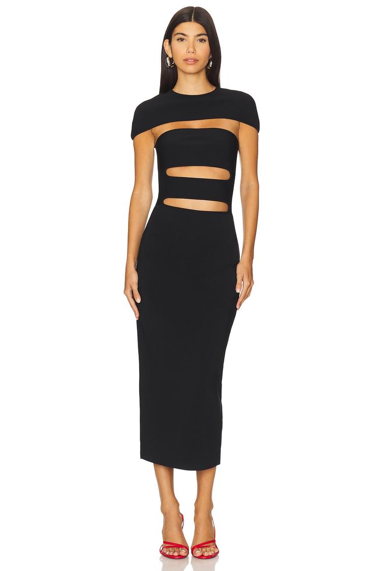 Sleek and daring, this black midi sheath dress features a figure-hugging bodycon fit crafted from a slinky viscose-nylon knit. The clean crew neckline and short sleeves provide a minimalist frame that contrasts strikingly with bold front cut-outs, adding a modern, sexy edge. Its covered back and pull-on slip-on style make it easy to wear for cocktail parties, night outs, or intimate date nights. The midweight knit fabric ensures comfort and form-flattering movement, making it a versatile staple for all weather occasions.