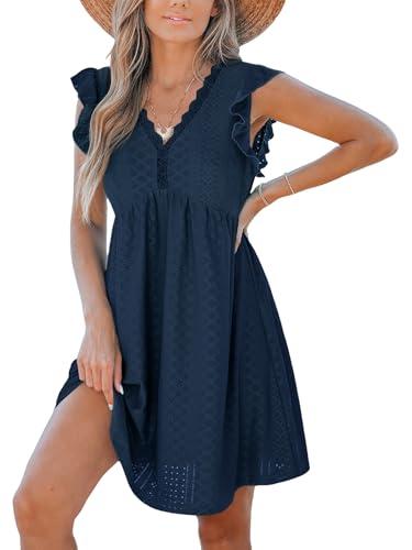 CUPSHE CROCHET SWIM COVER UP DRESS V NECK FLUTTER SLEEVE LACE BEACH PLEATED CASUAL SUMMER MINI SWIMWEAR COVERUP DRESS NAVY BLUE, M