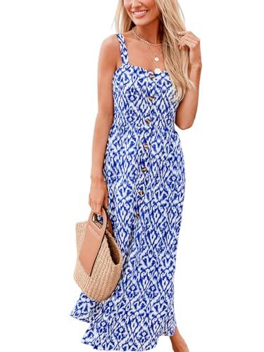 CUPSHE WOMEN RUFFLE SUMMER DRESS 2025 SWEETHEART NECK BUTTON FRONT STRAPS SLEEVELESS GEO CASUAL SUNDRESS HOLIDAY VACATION BEACH MAXI DRESS, BLUE L