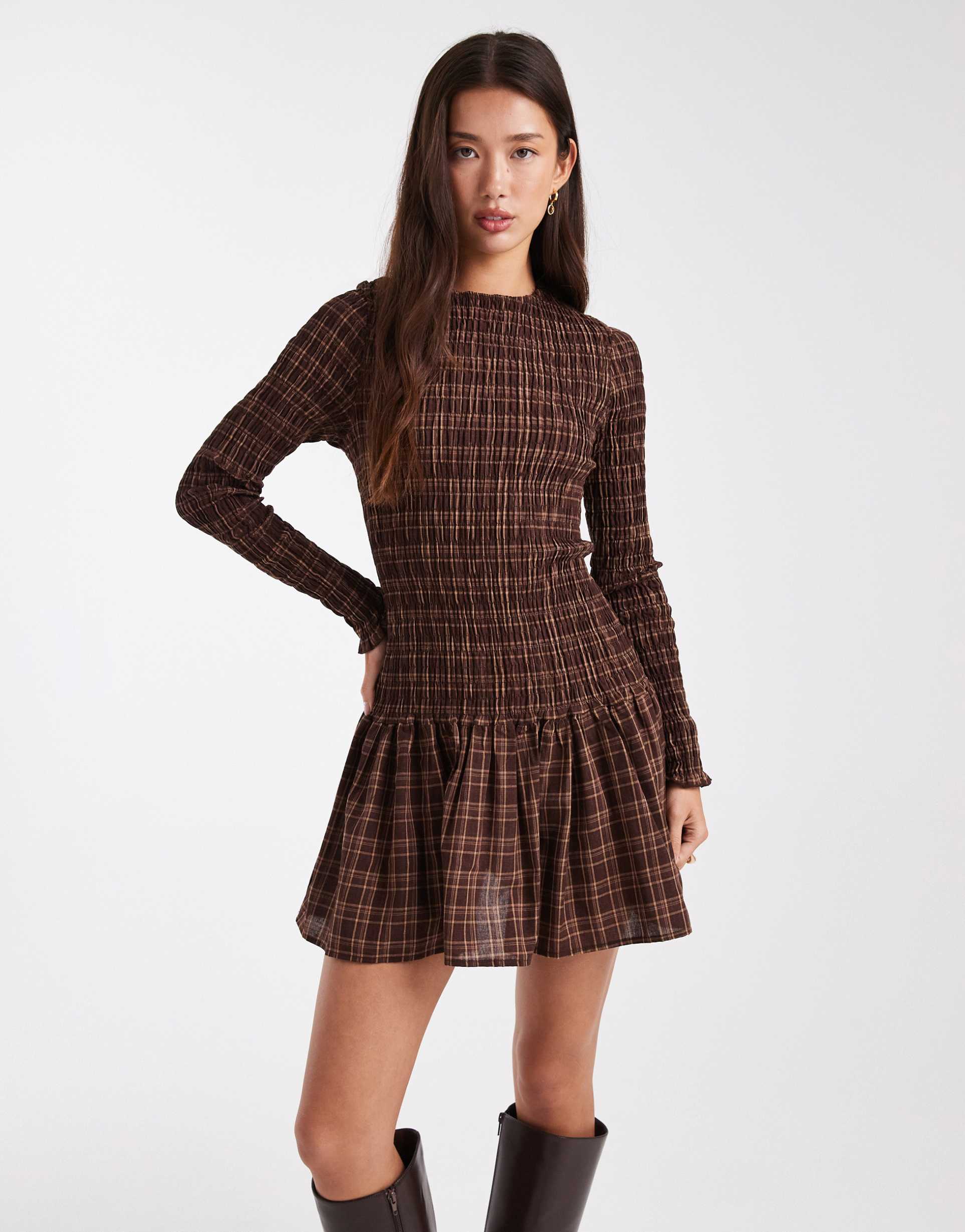 DAISY STREET DROPPED WAIST SHIRRED MINI DRESS IN BROWN PLAID