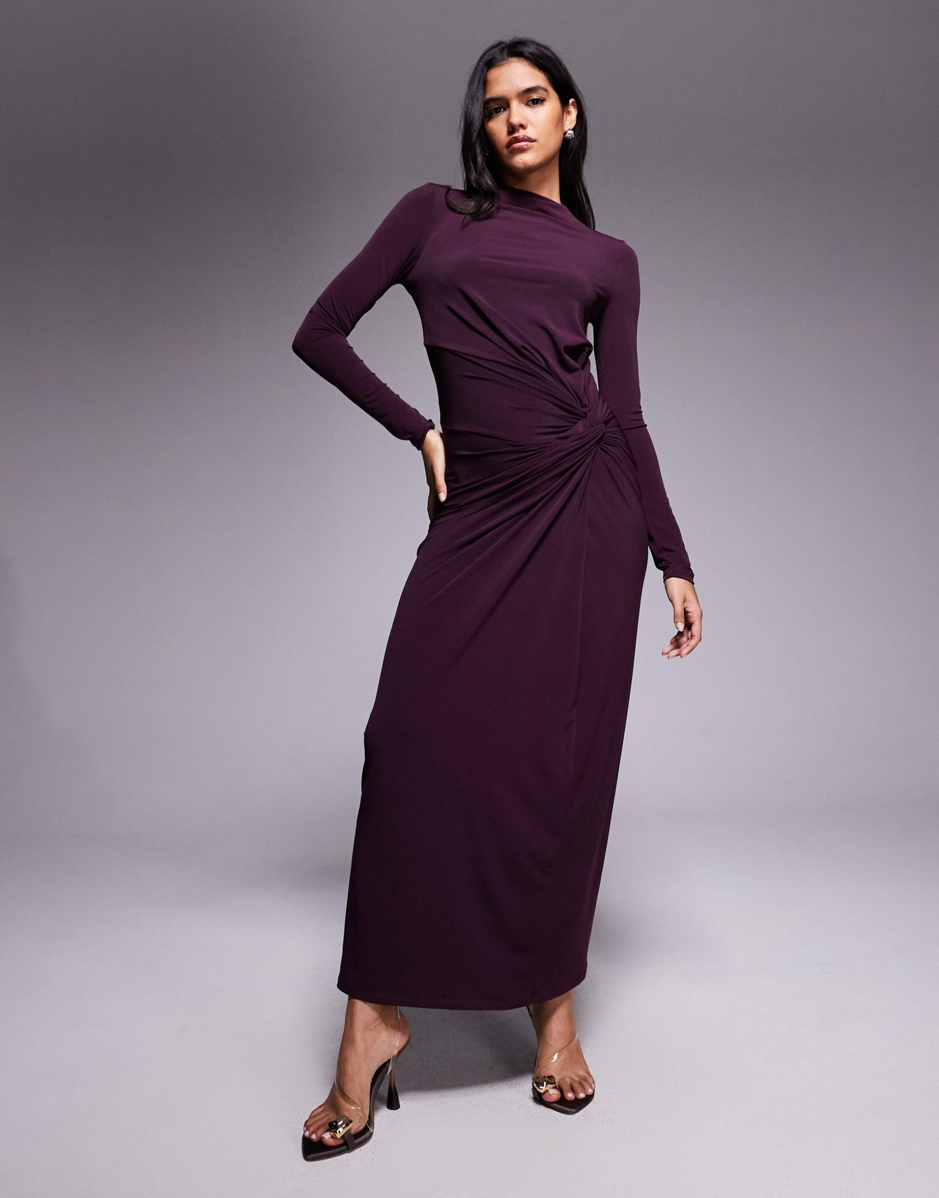 A rich matte purple jersey maxi with a high neckline and long sleeves delivers an elegant and sophisticated look. The column silhouette is enhanced by subtle draping twist details at the front, creating a flattering regular fit that skims the body effortlessly. Crafted from soft, stretchy polyester-elastane blend jersey, this dress offers comfort with a touch of refined style. Ideal for cocktail parties, night outs, and date nights, it embodies timeless sophistication for versatile all-weather wear.