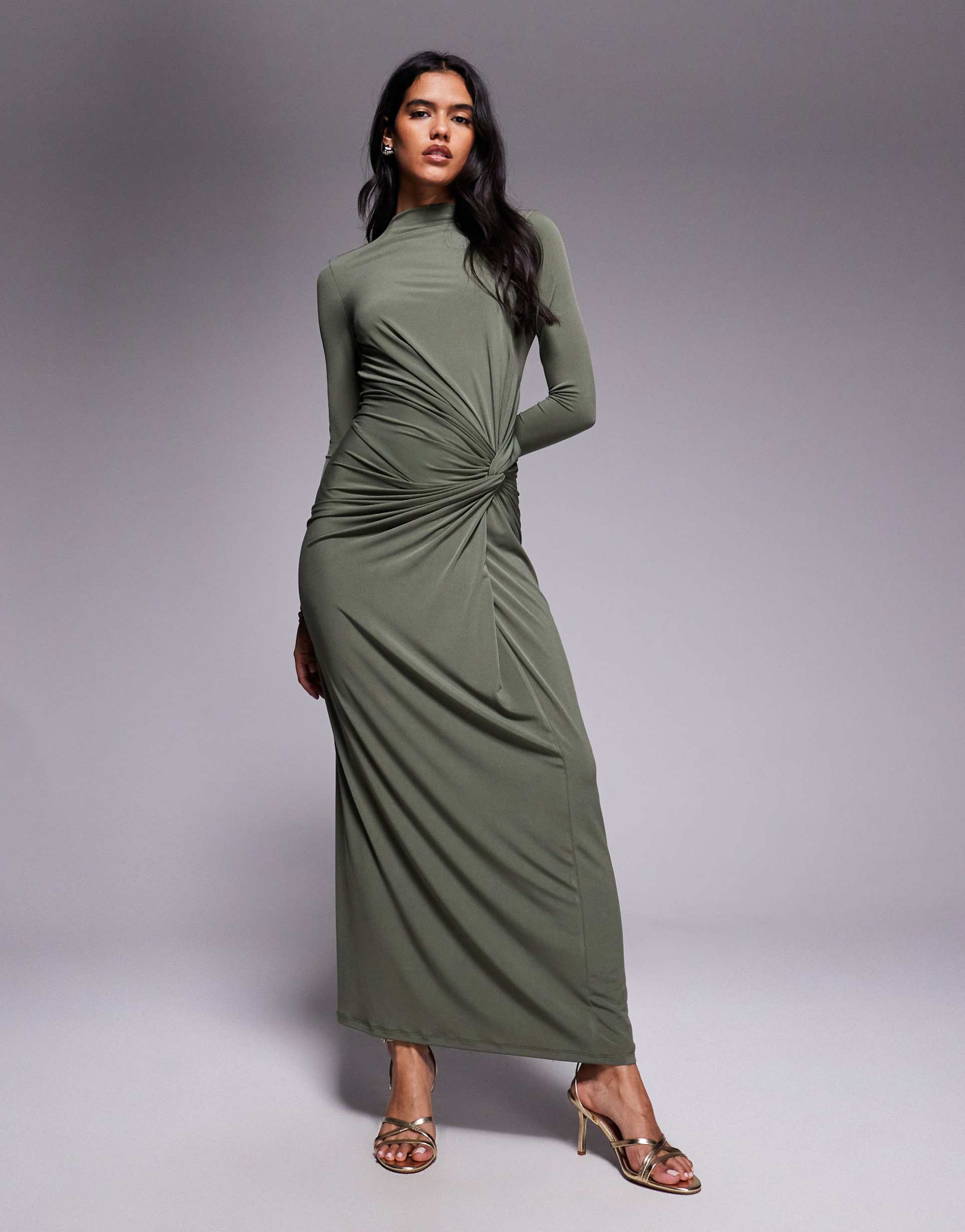 Soft jersey fabric and a sleek column silhouette define this high neck maxi dress in a rich olive hue. The regular fit and long sleeves offer comfortable coverage, while the distinctive front twist detail adds elegant draping and visual interest. Perfect for autumn and winter evenings, this versatile piece suits cocktail parties, date nights, and sophisticated night outs. Crafted with a blend of polyester and elastane, it provides gentle stretch for ease of movement and a flattering fit. Clean hemlines and minimalist styling complete this modern, refined look.